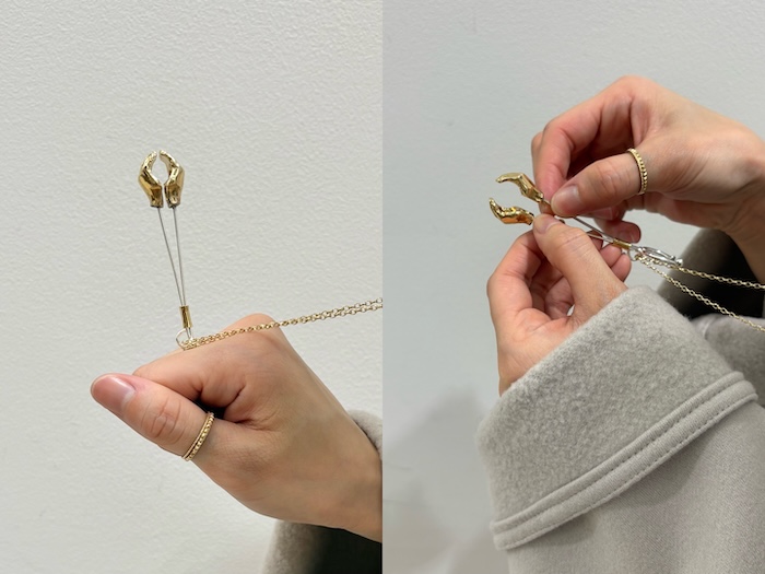 ハンドモチーフの両手でシガレットを挟むような作りで、毒のある遊び心とノスタルジーを感じさせるアイテムです。