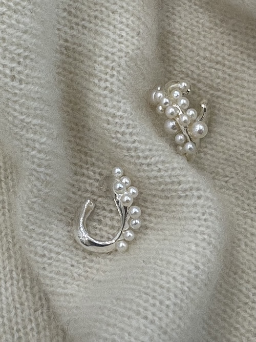 水滴のようにも植物のようにも見えるランダムに並ぶパールは、特別な装いの時だけでなく日常で身につけていただきたいです。